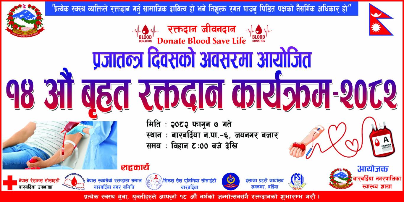 प्रजातन्त्र दिवसको अवसरमा आयोजित बृहत रक्तदान कार्यक्रम २०८२ मा आइ रक्तदान गरिदिनु हुन हार्दिक आमन्त्रण गर्दछौं।