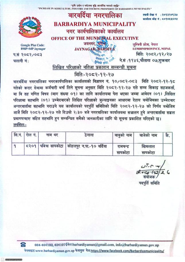 लिखित परीक्षाको नतिजा प्रकाशन सम्बन्धमा सूचना ।