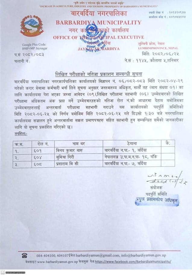 » लिखित परीक्षाको नतिजा प्रकाशन सम्बन्धी सूचना । (जनस्वास्थ्य अधिकृत सातौँ)