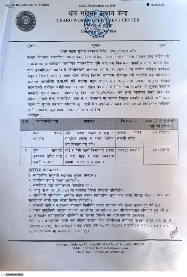 सिंचित क्षेत्रमा चैते धान प्रवर्द्धन कार्यक्रम सञ्चालनका लागी प्रस्ताव आह्वानको सूचना ।
