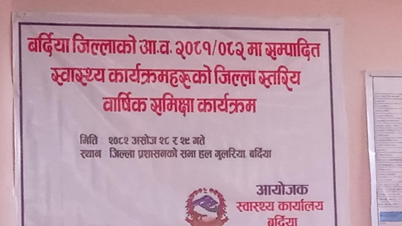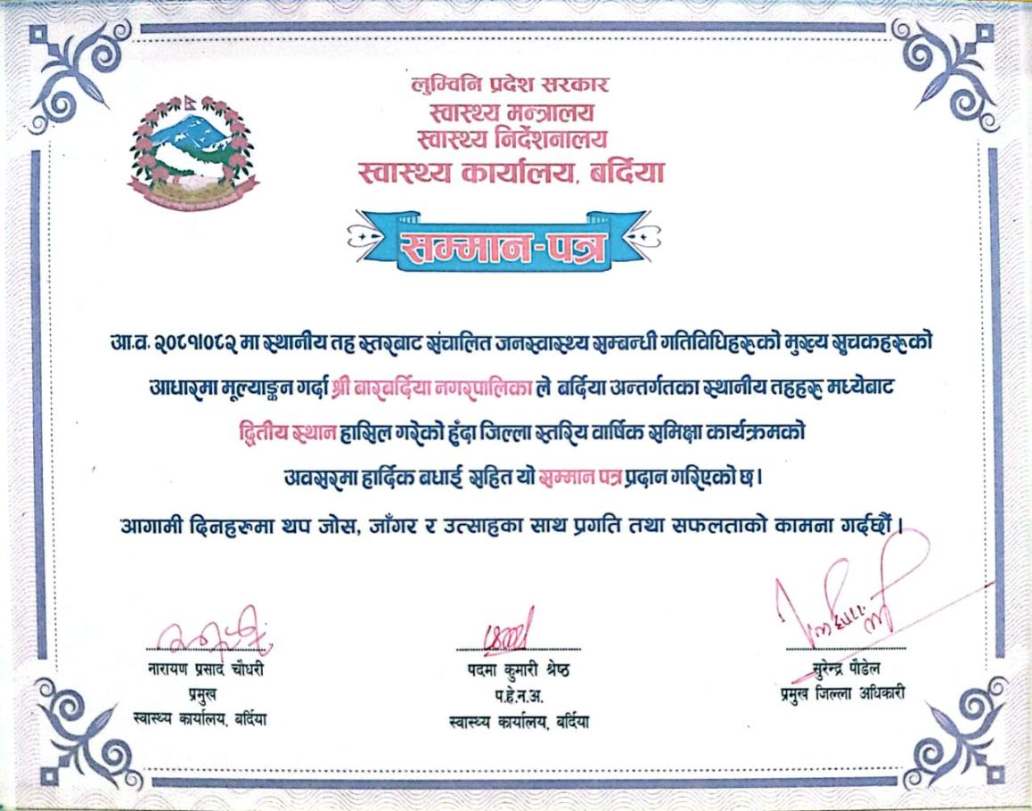 बर्दिया जिल्लाको आर्थिक वर्ष २०८१/०८२ मा सम्पादित जनस्वास्थ्य कार्यक्रमहरुको मुख्य सूचकको प्रगति मूल्यांकनको आधारमा बारबर्दिया नगरपालिकाले दोश्रो स्थान प्राप्त गर्न सफल भएकोमा सहयोग गर्नुहुने नगरपालिकाका सम्पुर्ण जनप्रतिनिधिहरु, आदरणीय व्यक्तित्वहरु, सम्पुर्ण स्वास्थ्य संस्था प्रमुख हरु ,सम्पुर्ण स्वास्थ्यकर्मी, समुदायमा अहोरात्र खटिने महिला सामुदायिक स्वास्थ्य स्वयम् सेबिका ज्यूहरु ,स्वास्थ्य कार्यलय बर्दियाको सम्पुर्ण टिम,सहयोगी सम्पुर्ण संघसंस्था तथा हामीलाई सहयोग गर्नुहुने सम्पुर्ण व्यक्तित्वहरुलाई धेरै धेरै धन्यवाद दिन चाहन्छौँ ।