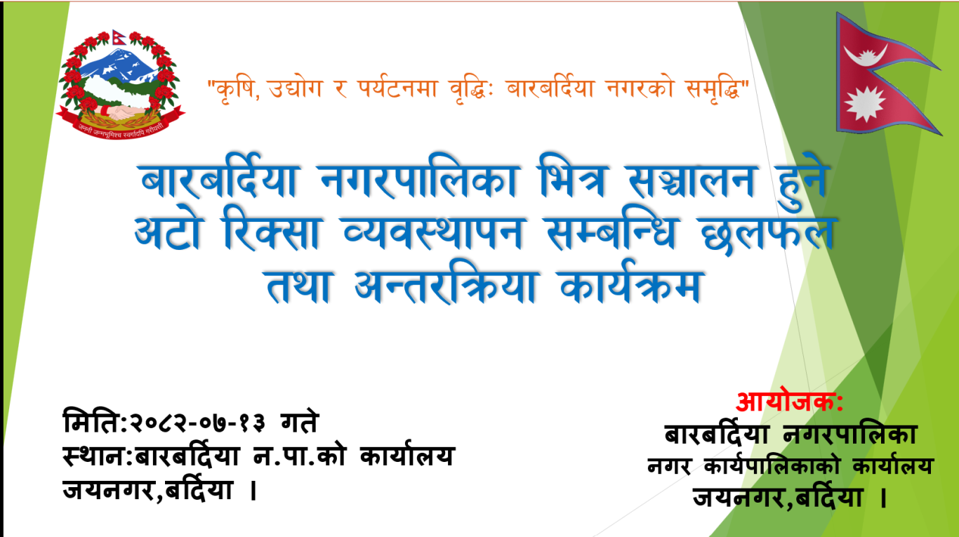 आज मिति २०८२-०७-१३ गतेका दिन यस बारबर्दिया नगरपालिकाको आयोजनामा यस नगरपालिकाभित्र सञ्चालन हुने अटो रिक्सा व्यवस्थापन सम्बन्धी छलफल तथा अन्तरक्रिया कार्यक्रम नगर प्रमुख श्री छविलाल थारु ज्यूको अध्यक्षतामा, जनप्रतिनिधि, राजनैतिक दल, सुरक्षा निकाय, अटो व्यवस