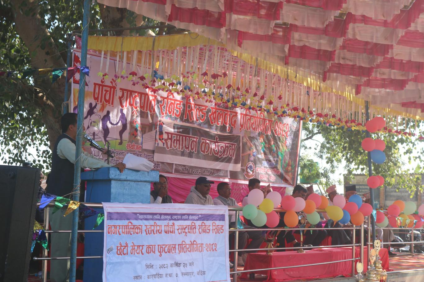 यस बारबर्दिया नगरपालिकाको आयोजना तथा श्री जनता माध्यमिक विधालय,रम्मापुर बर्दियाको संयोजनमा मिति २०८२-०७-२५ देखि २०८२-०७-३० गतेसम्म सञ्चालन खेलकुद प्रतियोगिता-२०८२, समापन समारोह कार्यक्रममा नगर प्रमुख श्री छविलाल थारु ज्यूको अध्यक्षता तथा प्रमुख प्रशासकीय अधिकृत गौतम भण्डारी ज्यूको आतिथ्य, जनप्रतिनिधि, राष्ट्र सेवक कर्मचारी, विधालयका प्रधानाध्यापक, शिक्षक, सुरक्षाकर्मी, पत्रकार, खेलाडी र सरोकारवाला महानुभावहरूको आतिथ्य तथा सहभागितामा सम्पन्न भयो ।