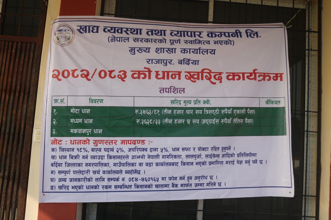 बारबर्दिया नगरपालिकाको समन्वयमा खाद्य व्यवस्था तथा ब्यापार कम्पनी लिमिटेड (मुख्य शाखा कार्यालय: राजापुर) द्वारा २०८२ कार्तिक २१ गते बिष्णुधनी प्राविधिक शिक्षालयको प्राङ्गणमा (ईलाका प्रहरी कार्यालय जयनगर नजिक) धान खरिद डिपोमा नेपाल सरकारले तोकेको न्युनतम समर्थन मुल्यमा धान खरिद गर्ने प्रयोजनार्थ स्थानीय धान खरिद डिपो उदघाटन कार्यक्रम आर्थिक विकास समितिका संयोजक श्री रामफेरन थारु ज्यूको अध्यक्षतामा ,नगर प्रमुख श्री छविलाल थारु ज्यूको प्रमुख आतिथ्य, वडा अध्यक्ष ज्यूहरु, सामाजिक विकास समिति संयोजक श्री श्याम कुमारी चौधरी ज्यू, खाद्य व्यवस्था तथा व्यापार कम्पनी लि.मुख्य शाखा राजापुरका कर्मचार