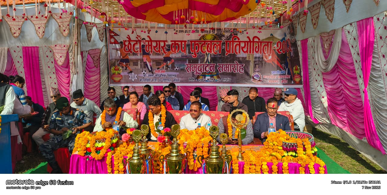 आज मिति २०८२ कार्तिक २१ गतेका दिन बारबर्दिया नगरपालिका जयनगर बर्दियाको आयोजना र जनता माध्यमिक विधालय रम्मापुरको संयोजनमा छैठौं मेयर कप फुटबल प्रतियोगिता-२०८२ को उद्घाटन कार्यक्रम बारबर्दिया नगरपालिकाका नगर प्रमुख श्री छविलाल थारु ज्यूको अध्यक्षता, लुम्विनी प्रदेश सभा सदस्य श्री राज कुमार चौधरी ज्यूको प्रमुख आतिथ्य, निमित्त प्रमुख प्रशासकीय अधिकृत श्री टिका नाथ गोसाई ज्यूको आतिथ्य, जनप्रतिनिधि, राष्ट्र सेवक कर्मचारी, विधालयका प्रधानाध्यापक, शिक्षक, सुरक्षाकर्मी, पत्रकार, खेलाडी र सरोकारवाला महानुभावहरूको आतिथ्य तथा सहभागितामा सम्पन्न भयो ।