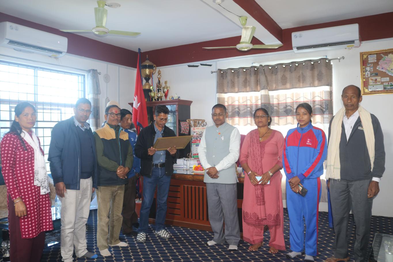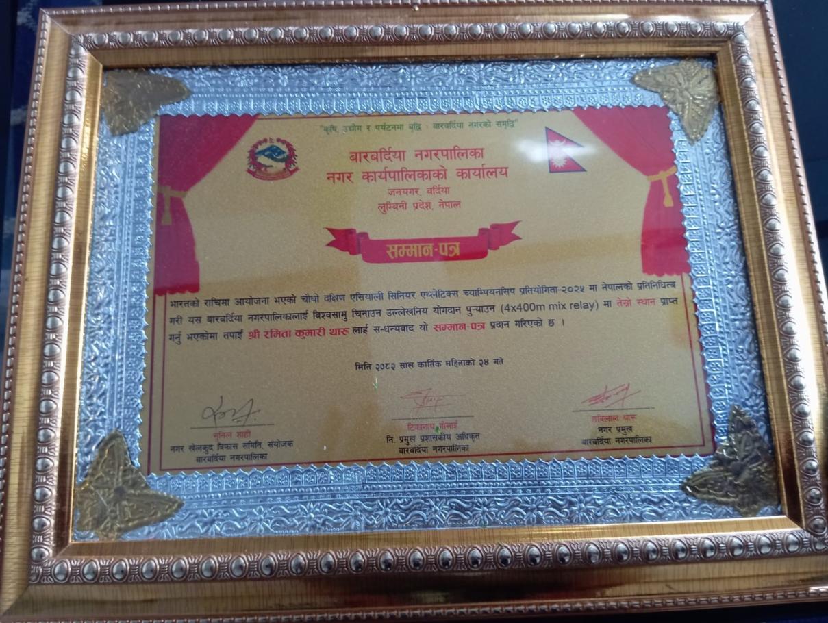 मिति २०८२-०७-२४ गतेका दिन बारबर्दिया नगरपालिकाका नगर प्रमुख श्री छविलाल थारु ज्यूद्बारा भारतको राचिमा आयोजना भएको चौथो एसियाली सिनियर एथ्लेटिक्स च्याम्पियनसिप प्रतियोगिता-२०२५मा नेपालको प्रतिनिधित्व गरी यस बारबर्दिया नगरपालिकालाई विश्वसामु चिनाउन उल्लेखित योगदान पुर्याई (4x400M Mix Relay) तेस्रो स्थान प्राप्त गर्नुहुने बारबर्दिया नगरपालिका वडा नं. २ श्री रमिता कुमारी थारु ज्यूलाई सम्मान पत्र र नगद रु ५,००० सहित सम्मानित गर्नुभयो ।