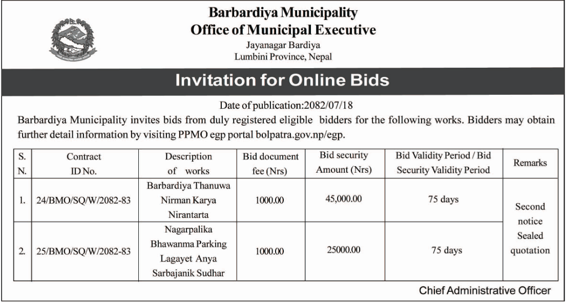 अनलाइन बोलपत्र आह्वान सम्बन्धी सूचना । मिति २०८२-०७-१८