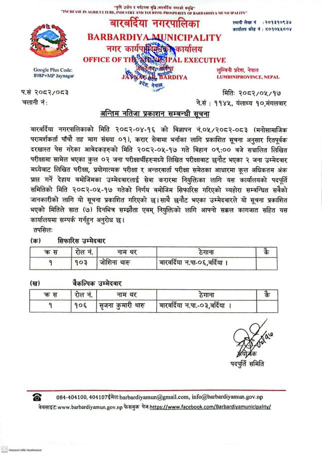 अन्तिम नतिजा प्रकाशन सम्बन्धी सूचना ।