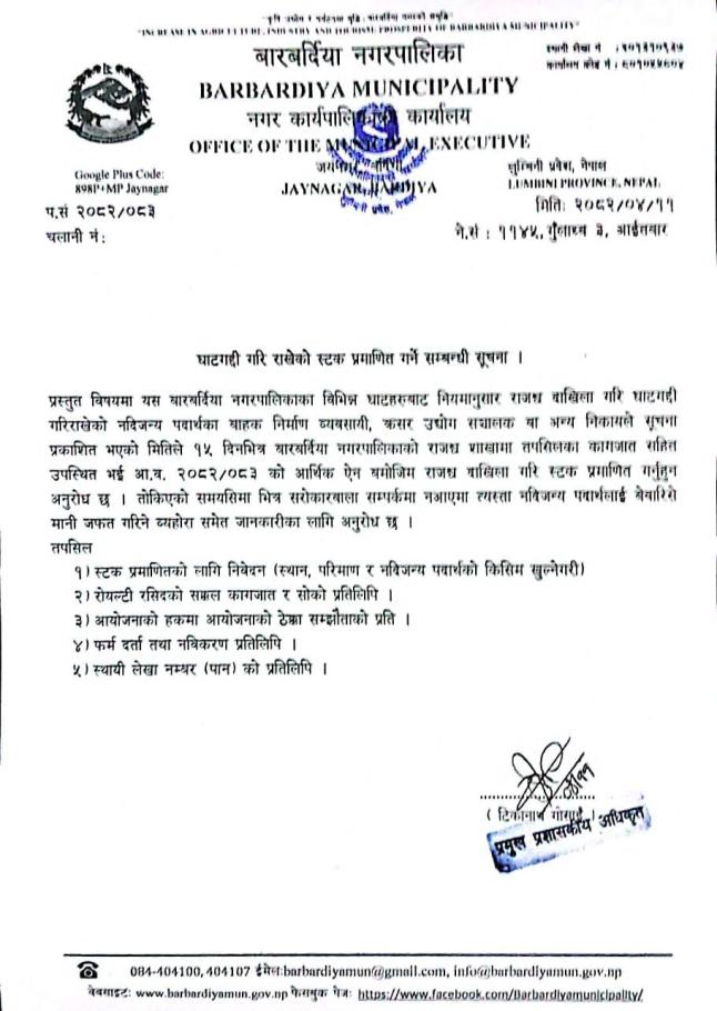 » घाटगद्दी गरि राखेको स्टक प्रमाणित गर्ने सम्बन्धी सूचना ।