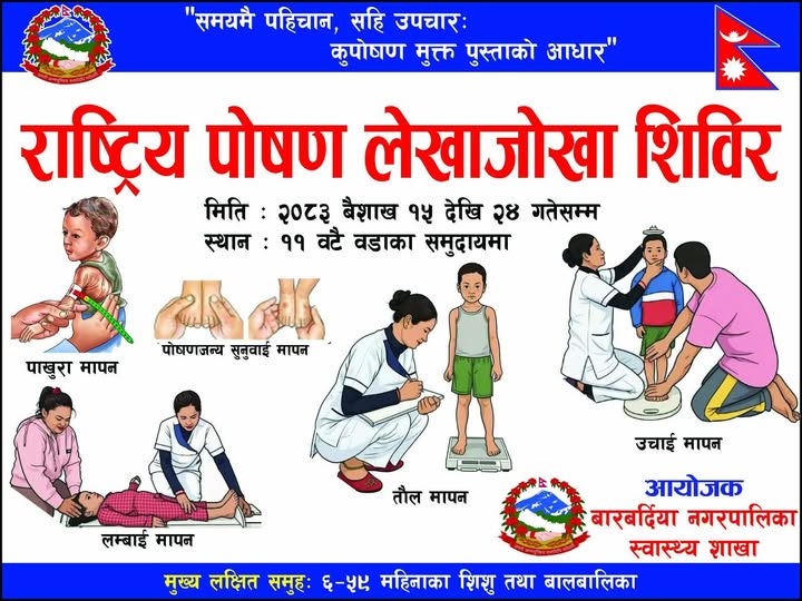 जानकारीका लागि।। यहि बैशाख १५ गतेदेखि २४ गते सम्म बारबर्दिया नगरपालिकाका ११ वटै वडाका ४५ स्थानमा पोषण लेखाजोखा कार्यक्रम संचालन हुदैछ।