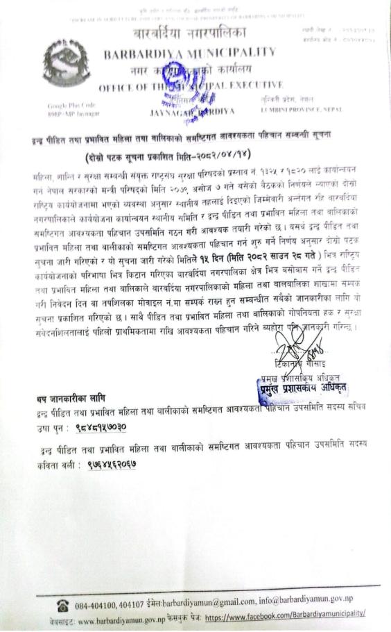 » द्बन्द्ब पीडित तथा महिला तथा बालिकाको समष्टिगत आवश्यकता पहिचान सम्बन्धी सूचना ।