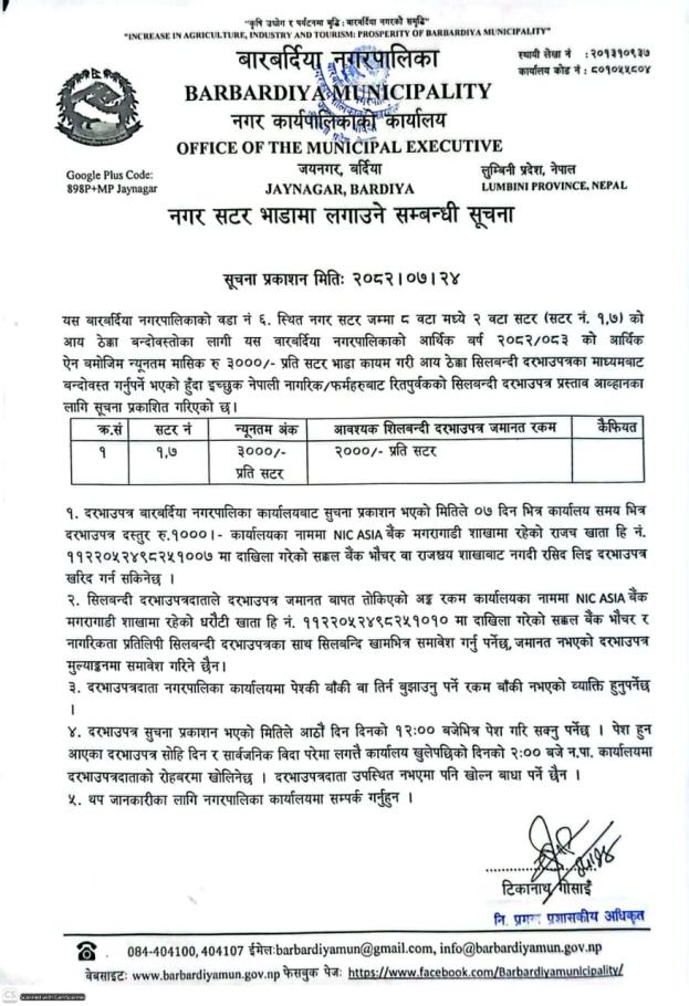 नगर सटर भाडामा लगाउने सम्बन्धी सूचना । 2082-07-27