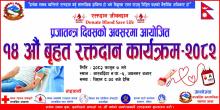 प्रजातन्त्र दिवसको अवसरमा आयोजित बृहत रक्तदान कार्यक्रम २०८२ मा आइ रक्तदान गरिदिनु हुन हार्दिक आमन्त्रण गर्दछौं।