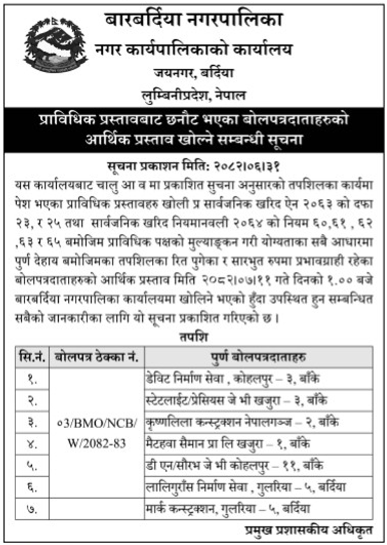 प्राविधिक प्रस्तावबाट छनौट भएका बोलपत्र दाताहरुको आर्थिक प्रस्ताव खोल्ने सम्बन्धी सूचना । सूचना प्रकाशन मिति:२०८२।०६।३१