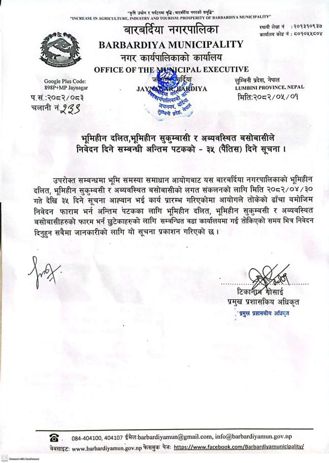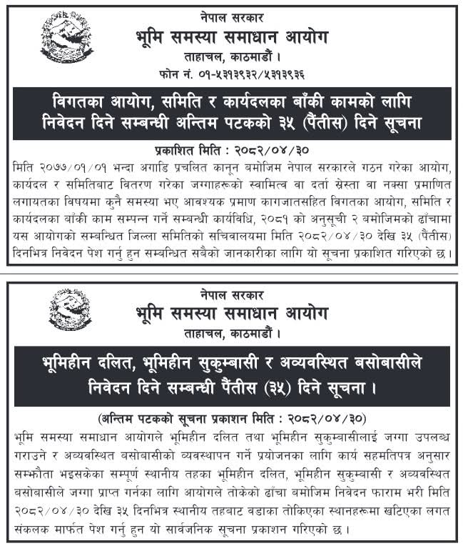 भूमिहिन दलित,भूमिहिन सुकुम्वासी र अव्यवस्थित बसोबासीले निवेदन दिने सम्बन्धी ३५ दिने सूचना ।