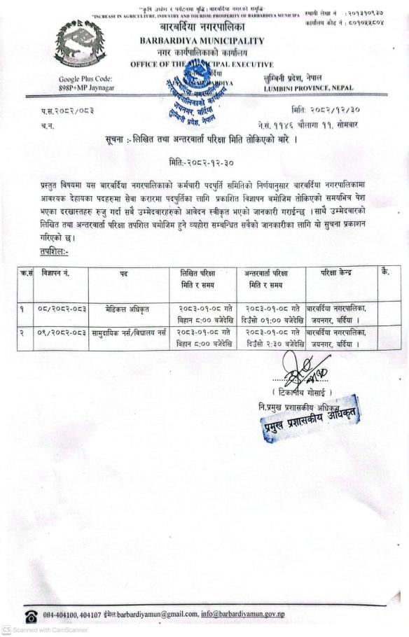मेडिकल अधिकृत र सामुदायिक नर्स/विद्यालय नर्सको लिखित तथा अन्तरवार्ता परिक्षा मिति तोकिएको बारे ।