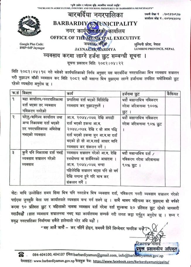 » व्यवसाय करमा लाग्ने हर्जना छुट सम्बन्धि सूचना ।