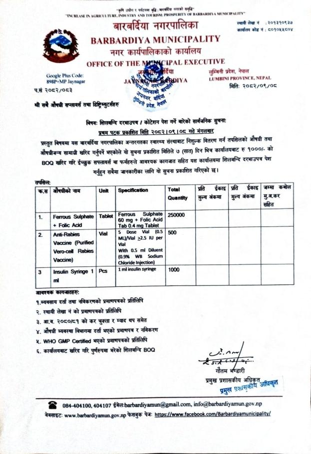 » शिलबन्दि दरभाउपत्र / कोटेशन पेश गर्ने बारेको सार्वजनिक सुचना।