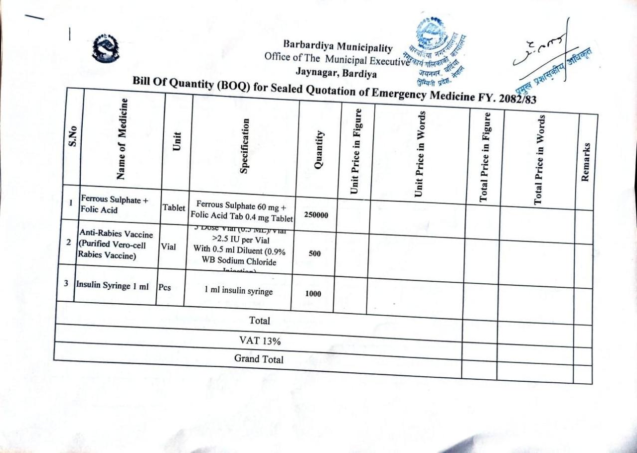 शिलबन्दि दरभाउपत्र / कोटेशन पेश गर्ने बारेको सार्वजनिक सुचना।