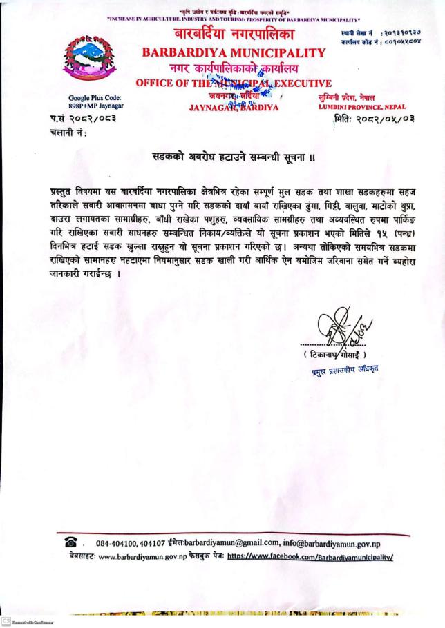 सडकको अवरोध हटाउने सम्बन्धी सूचना ।