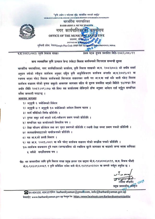 साना व्यवसायिक कृषि उत्पादन केन्द्र (पकेट) विकास कार्यक्रमको निरन्तरता सम्बन्धी सूचना ।