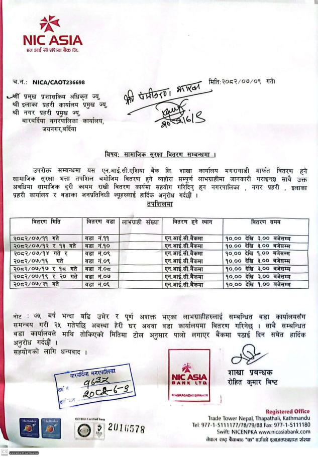सामाजिक सुरक्षा भत्ता वितरण सम्बन्धमा । २०८२-०७-०९ गते