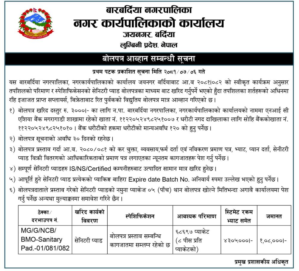 स्यानिटरी प्याड खरिद सम्बन्धी सूचना ।