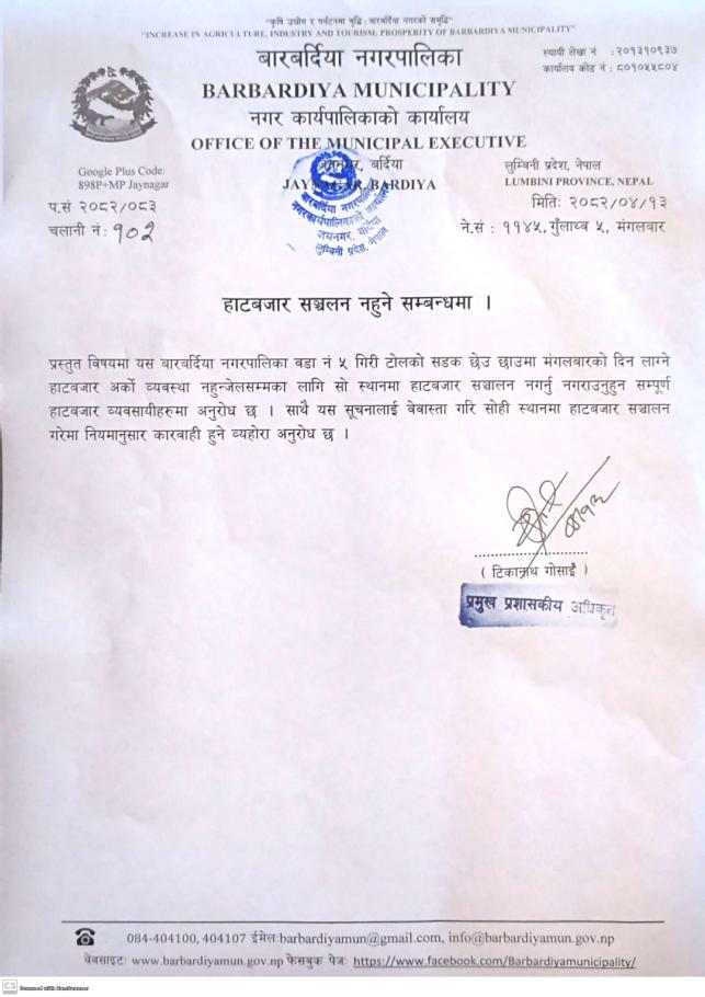 हाटबजार सञ्चालन नहुने सम्बन्धमा ।