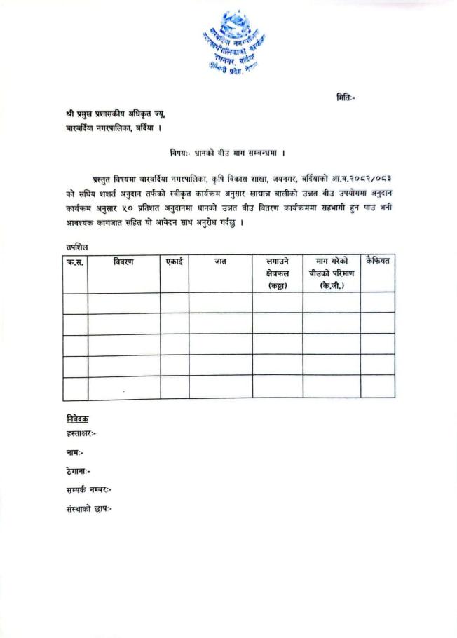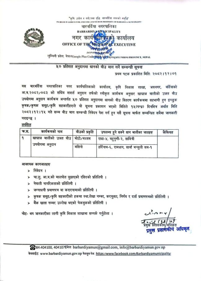 » ५० प्रतिशत अनुदानमा धानको बीउ माग गर्ने सम्बन्धी सूचना ।