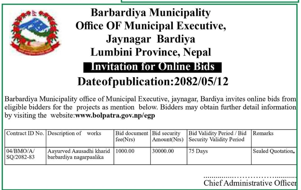 » Invitation for Online Bids for Aayurved Aausadhi Kharid Barbardiya Nagarpalika