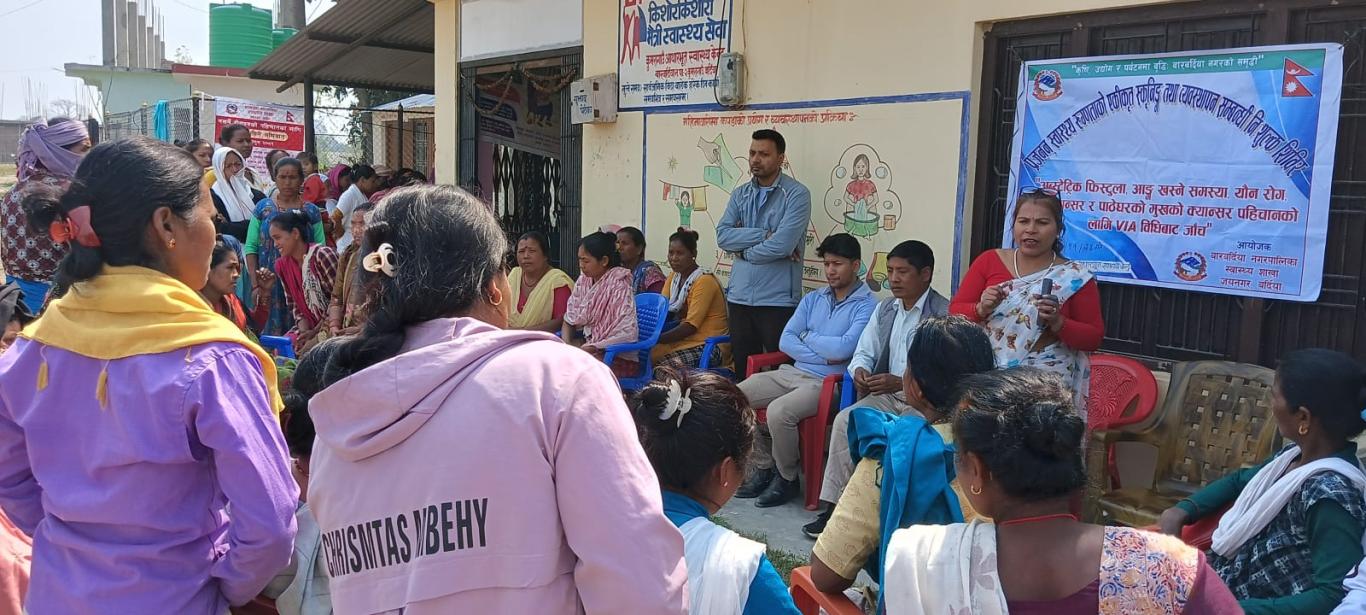 मिति २०८१-११-२५ गतेका दिन बारबर्दिया नगरपालिका वडा नं.२ कुमरागाउँ आ.स्वा.के. मा प्रजनन् रुग्णताको एकिकृत स्कृनिङ्ग तथा ब्यवस्थापन सम्बन्धि नि:शुल्क शिविर" अब्स्टेट्रिक फिस्टुला, आङ्ग खस्ने समस्या, यौन रोग, स्तन क्यान्सर र पाठेघरको मुखको क्यान्सर पहिचानको