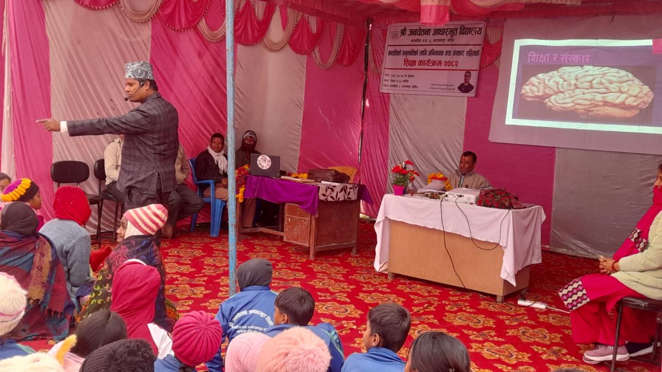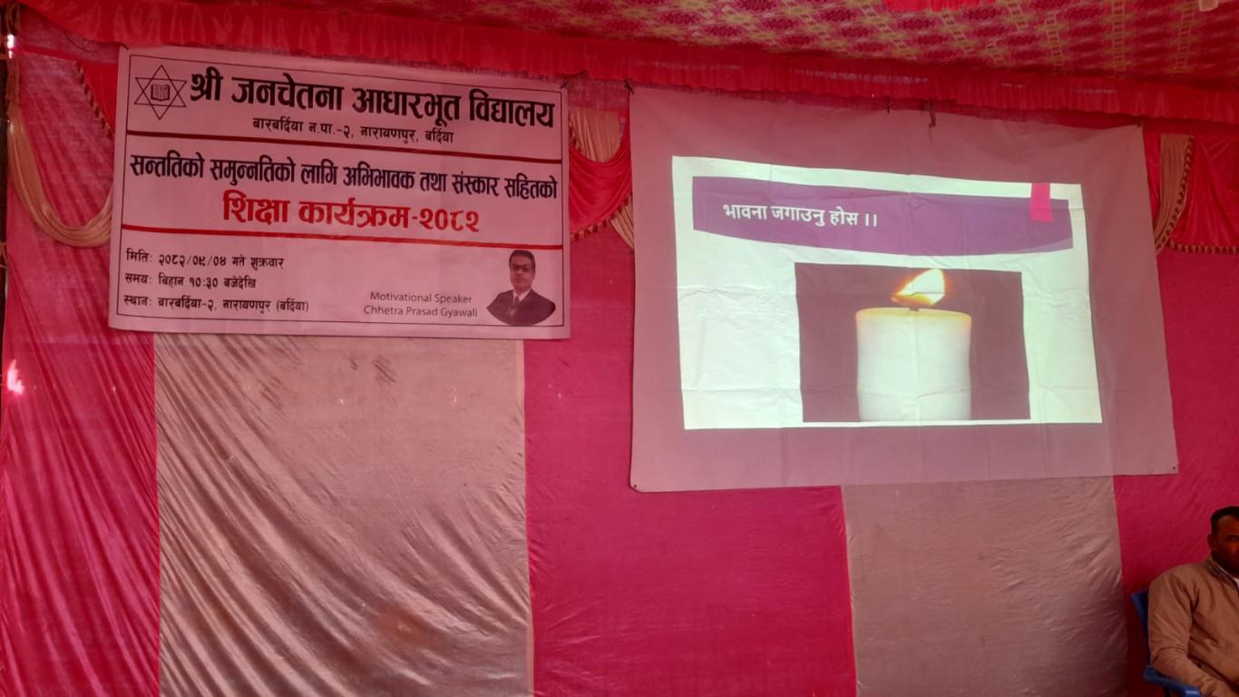 आज मिति २०८२-०९-०४ गते श्री जनचेतना आधारभूत विद्यालय बारबर्दिया नगरपालिका वडा नं. २,नारायणपुरमा सन्ततिको समुन्नतिको लागि अभिभावक शिक्षा तथा संस्कार सहितको शिक्षा कार्यक्रम -२०८२, विद्यालय व्यवस्थापन समितिका अध्यक्ष श्री रामनरेश थारु ज्यूको अध्यक्षता, नेपालको प्रसिद्ध शैक्षिक अभियन्ता श्री क्षेत्र प्रसाद ज्ञवाली ज्यूबाट प्रशिक्षण, शिक्षक, अभिभावक, विधार्थी लगाएतको उपस्थितिमा उक्त कार्यक्रम सम्पन्न भयो ।
