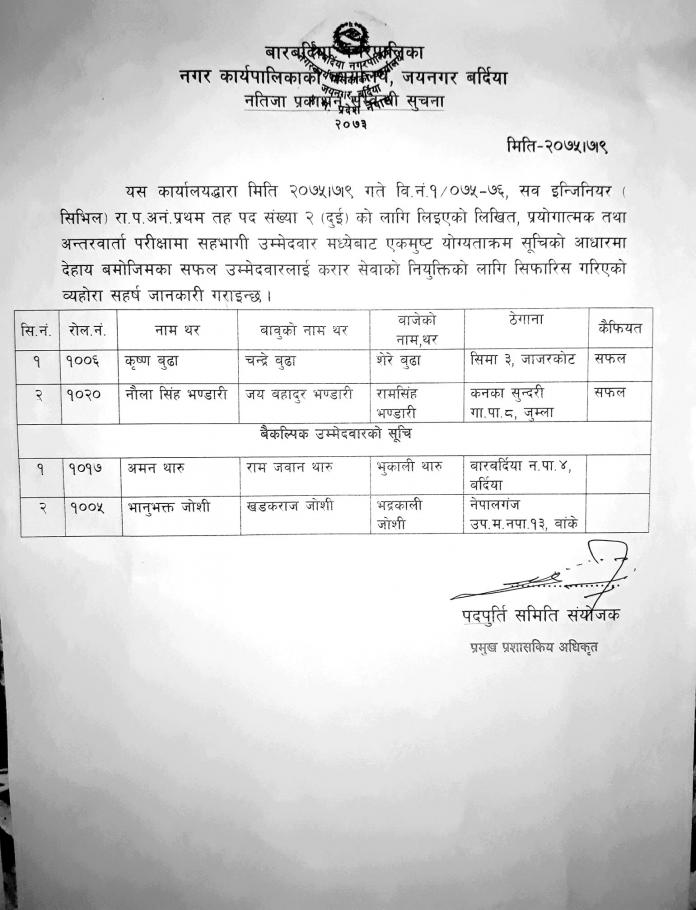 वि.नं.१/०७५-७६ पद: सव इन्जिनियर (सिभिल) पदको नतिजा प्रकाशन सम्बन्धि सुचना